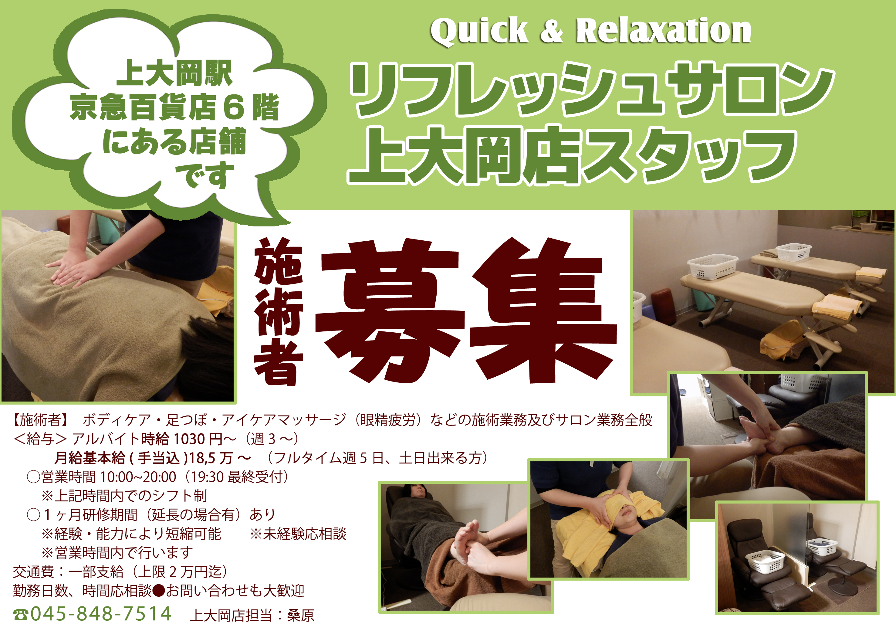 【施術者】 ボディケア・足つぼ・アイケアマッサージ(眼精疲労)などの施術業務及びサロン業務全般